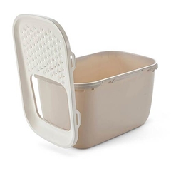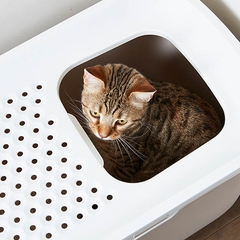 La característica más destacable de este aseo para gatos es la tapa perforada y ligeramente inclinada. Cuando el gato anda por ella para salir del arenero, deja caer al interior los restos que le pudieron quedar pegados en las patitas. De esta manera tendremos la zona exterior más limpia y recogida.