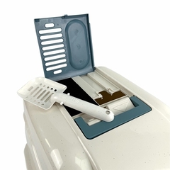 En la parte superior dispone de un asa de transporte, ranuras de ventilación para la colocación de filtros de carbón activo que capturan y neutralizan los olores y un compartimento para guardar la paleta de la arena.
