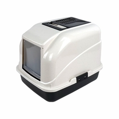 Aseo cerrado para gatos, con puerta frontal abatible que facilita el acceso y la limpieza.