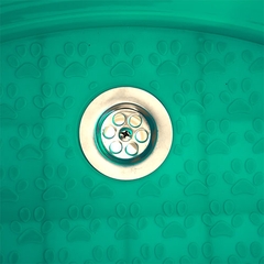 Dispone de 3 argollas para poder sujetar a la mascota y huecos para colocar el champú. Tapón de goma para el desagüe.