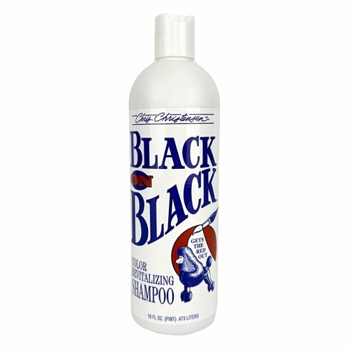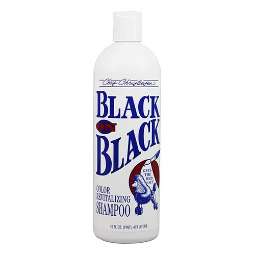 Champú Black on Black de Chris Christensen diseñado para restaurar y potenciar el color negro del pelo de perros y gatos.