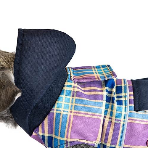 Con su graciosa capucha, y el estampado de cuadros en tonos lavanda y azul, su perro será el más alegre bajo la lluvia.