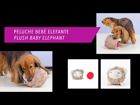 Pelota de peluche con apariencia de elefante. Combina el tacto suave y blando del peluche, con una parte de goma con pinchos. Además tiene una zona que cruje al tacto, y emite un pitido cuando se presiona la pelota. Esta combinación de texturas y sonidos es muy estimulante para cualquier mascota.