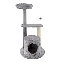 El árbol rascador incluye un poste vertical forrado con sisal resistente, proporcionando una superficie ideal para rascar y mantener sus uñas afiladas. En la segunda altura, una plataforma con una pelotita enganchada a un muelle, invita a su gato a jugar y entretenerse.