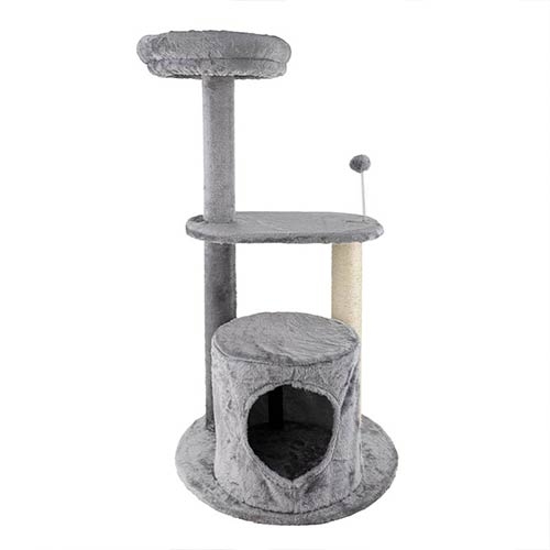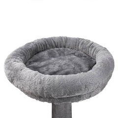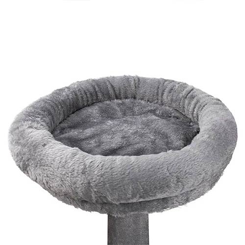 En la parte superior, una base redonda con exterior mullido ofrece un espacio confortable donde descansar y vigilar el entorno desde una posición elevada.