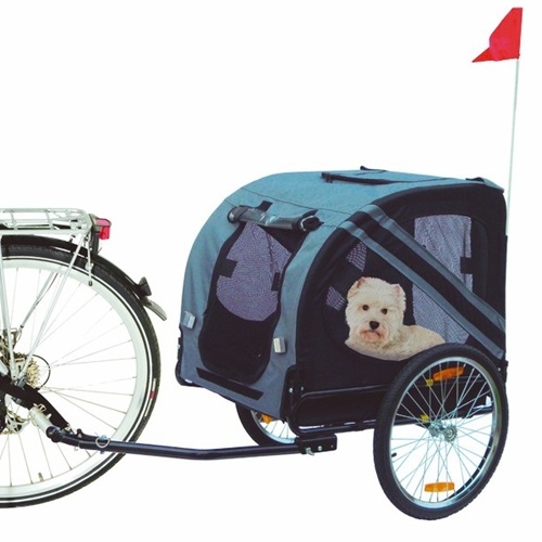 Práctico y resistente carro-remolque de bicicleta para perros.